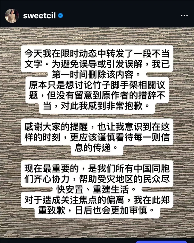 在香港大埔宏福苑五级大火的悲痛时刻,汪诗诗因未审慎核查内容,转发了一则将火灾原因错误归因的外网动态。意识到问题后,汪诗诗迅速删除相关动态,先后在微博及Instagram平台发布道歉声明,坦言自身存在“未仔细审核转发内容”的疏漏,对引发的争议深表歉意,明确表态尊重官方调查结果、坚守家国一体的立场。