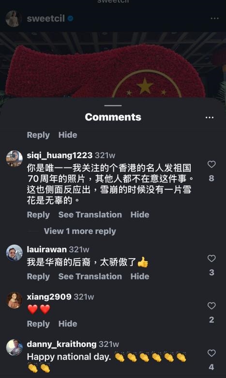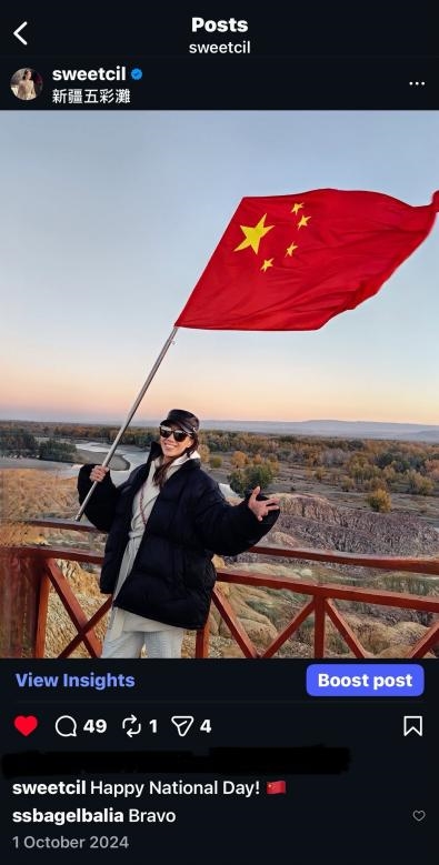 汪诗诗作为常年活跃于中外社交平台的公众人物家属,她曾多次主动在外网发布爱国言论:在某些境外势力试图歪曲香港国安法时,她曾晒出香港街头国旗飘扬的照片,配文 “国安法护佑下的香港,才是安稳的家”,直接驳斥不实言论;每逢国庆、香港回归纪念日等重要节点,她都会准时在社交平台发布祝福内容,分享与家人参与爱国主题活动的见闻,以自身影响力向海内外网友传递正向的国家认同。